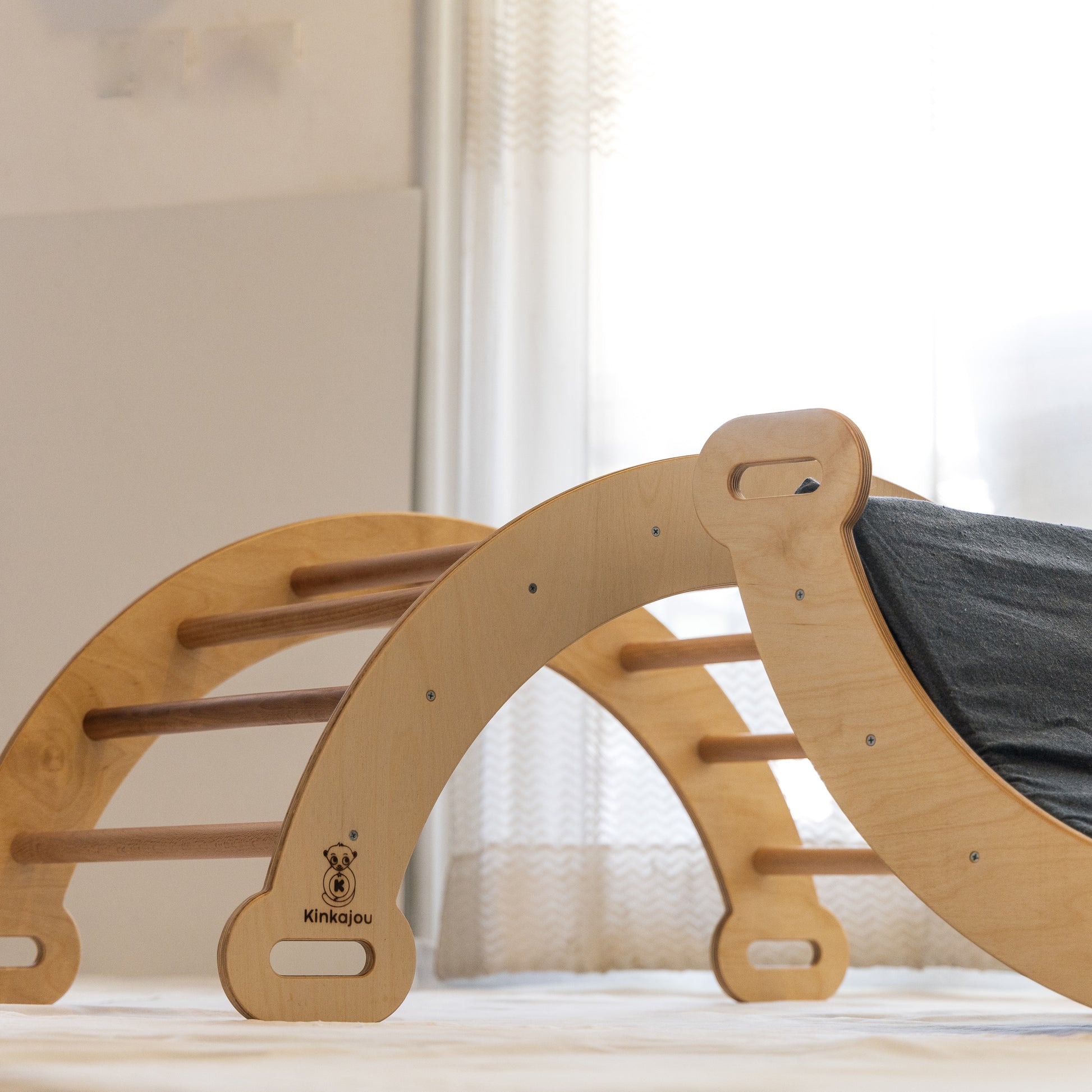 The Rocker-Climber is one of our most versatile toys. Babies starting 8 months old can practice grabbing onto it and pulling themselves up. You can also put a mat under the rocker-climber and attach a baby gym to one of the rods to stimulate your baby. Once the children get older, they can use the toy to climb, rock, nap, chill and read their books, … Due to the big size, some adults even enjoy rocking in it with or without their children. Tested up to 95 kilograms.